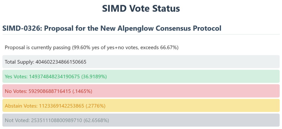 The quorum threshold of 33% of votes has also been reached, meaning Alpenglow is now almost certain to pass if the current voter trajectory remains the same.