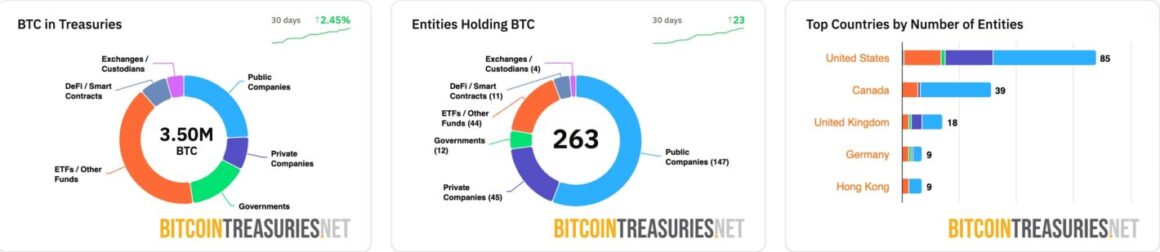 There are currently 268 institutions holding BTC on their balance sheets, including public companies, private enterprises, government organizations, asset managers, and crypto firms, according to BitcoinTreasuries.