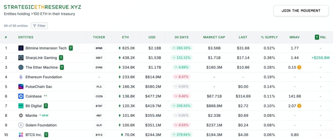 The buying spree comes on the heels of BitMine’s aggressive pivot into Ether. StrategicEtherReserves shows BitMine as the largest Ether treasury firm with 625,000 Ether, followed by SharpLink Gaming with 438,200 ETH.