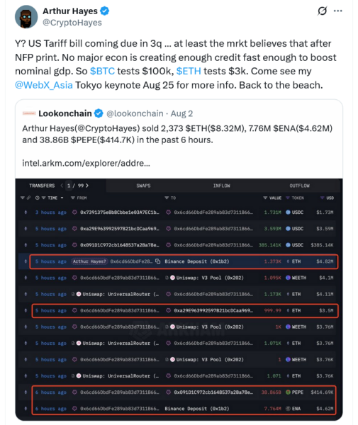 His comments on Saturday came in response to an X post from blockchain analytics platform Lookonchain, which highlighted that Hayes recently offloaded $8.32 million worth of ETH, $4.62 million of Ethena and $414,700 of the Pepe memecoin.