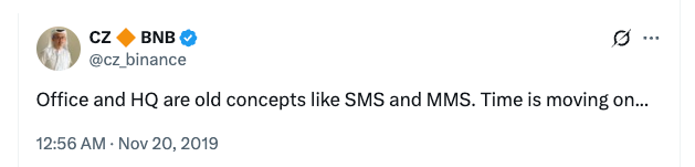 In 2019, Zhao said that offices and headquarters are “old concepts like SMS and MMS.”