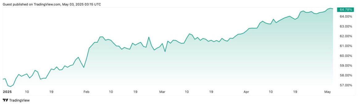 Bitcoin dominance — the ratio of Bitcoin’s market capitalization to the entire crypto market — is 64.78% at the time of publication, according to TradingView data.
