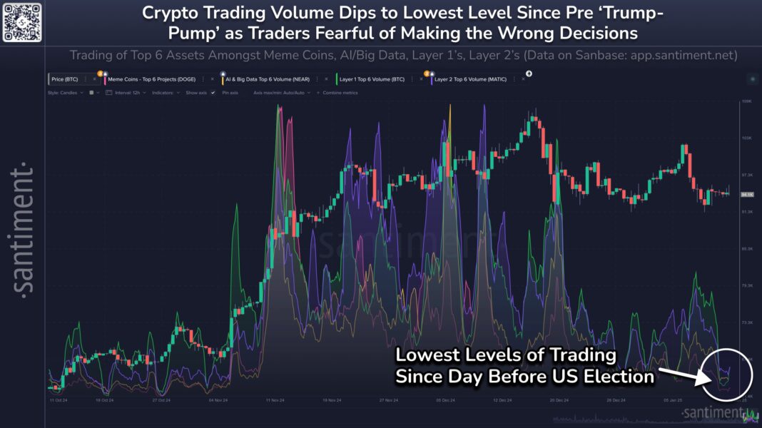 The trading volume around some of the top cryptocurrencies decreased to a more than two-month low not seen since before the United States elections, according to market intelligence platform Santiment’s Jan. 13 X post: