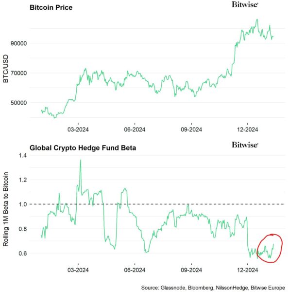 “1 million beta of global hedge funds’ performance to BTC has increased from its recent cycle lows signaling increasing market exposure to Bitcoin & other crypto assets.”
