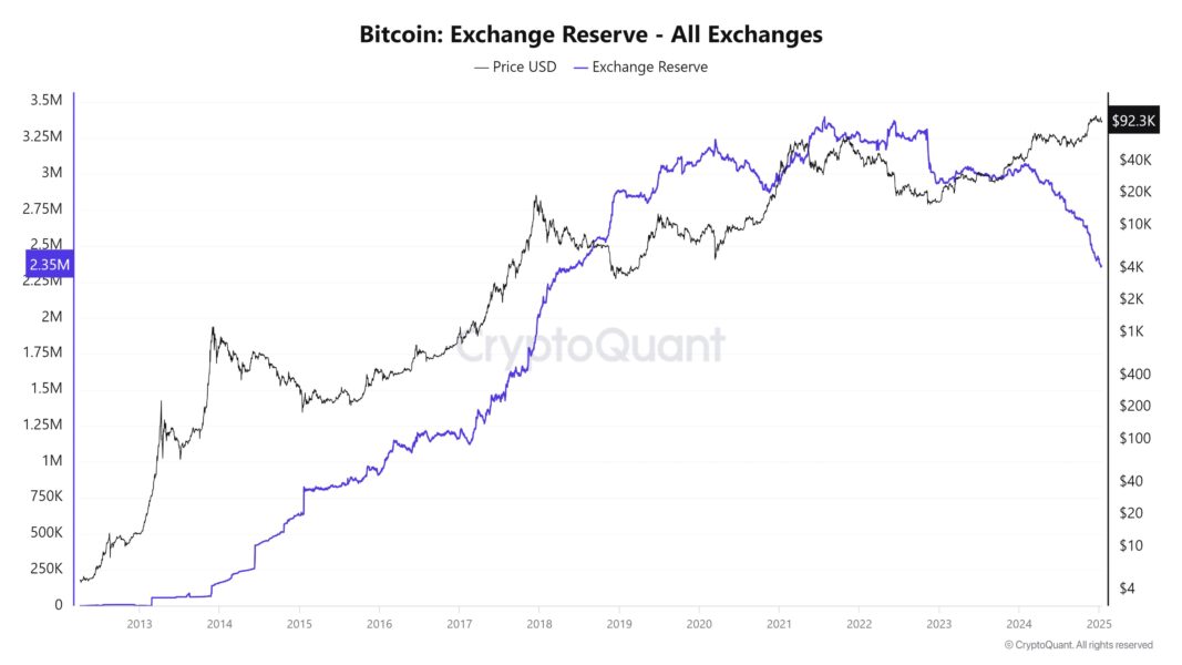 Bitcoin reserves across all cryptocurrency exchanges fell to 2.35 million BTC as of Jan. 13, which marked a near seven-year low not seen since June 2018, when Bitcoin was trading just above $7,000, CryptoQuant data shows.