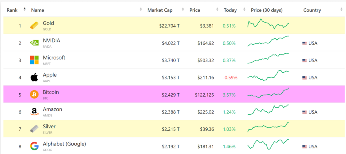 These gains allowed Bitcoin to surpass a $2.4 trillion market capitalization, overtaking Amazon’s $2.3 trillion, Silver’s $2.2 trillion and Alphabet’s (Google) $2.19 trillion, data shows.