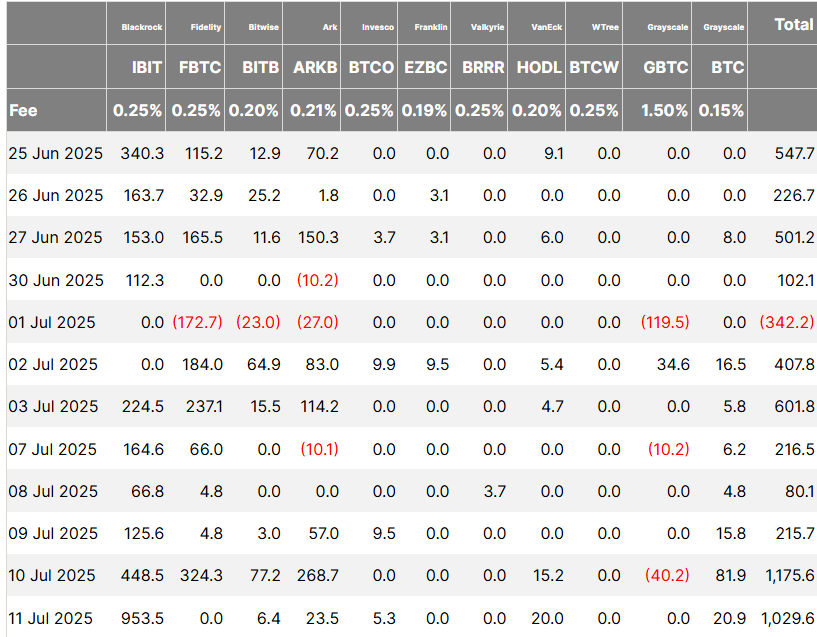 Spot Bitcoin ETFs amassed over $1 billion worth of net positive inflows on Friday, marking a seventh consecutive day of investments, Farside Investors data shows.