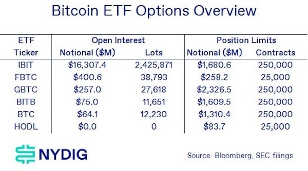 The SEC on Tuesday increased the number of allowed options contracts from 25,000 to 250,000 “for all ETFs with options,” which includes the iShares Bitcoin Trust ETF (IBIT) but not the Fidelity Wise Origin Bitcoin Fund (FBTC), NYDIG’s global head of research, Greg Cipolaro, said in a report on Friday.