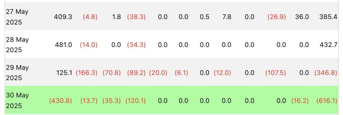 Overall, the 11 US spot Bitcoin ETFs recorded net outflows for the second consecutive day on May 30, totaling $616.1 million.