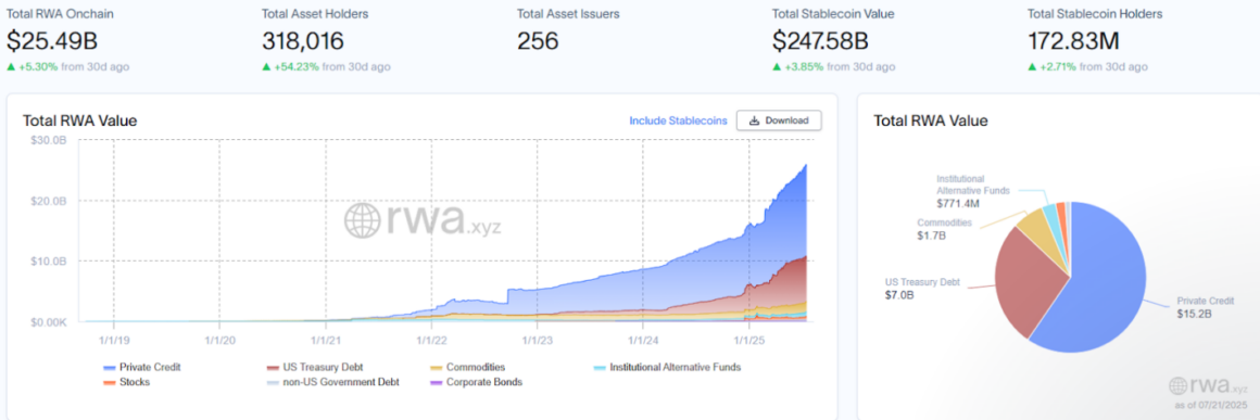 Onchain RWAs recently reached a cumulative all-time high of over $25.4 billion across 318,000 total asset holders, excluding the value of stablecoins, according to data from RWA.xyz.