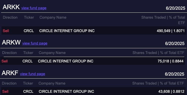 The largest fund, ARKK, sold 490,549 CRCL shares, while ARKW and ARKF offloaded 75,018 shares and 43,608 shares, respectively.