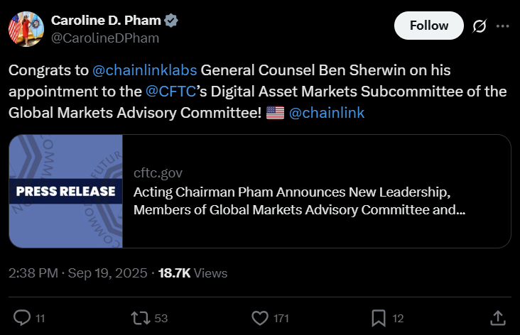 CFTC Acting Chair Caroline D. Pham named four new DAMS members: Katherine Minarik, chief legal officer at Uniswap Labs; Avery Ching, co-founder and chief technology officer of Aptos Labs; James J. Hill, managing director and head of structure innovation at BNY; and Ben Sherwin, general counsel at Chainlink Labs.