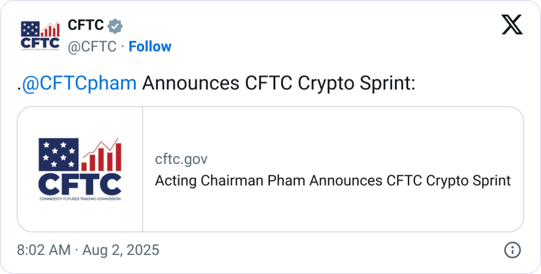 The US Commodity Futures Trading Commission has launched a “crypto sprint” to begin implementing crypto-related recommendations the Trump administration released on Wednesday.
