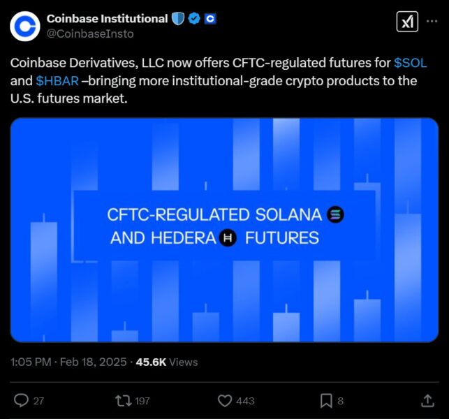 Coinbase has launched Solana futures contracts on its regulated US derivatives exchange, the cryptocurrency trading platform said on Feb. 19.