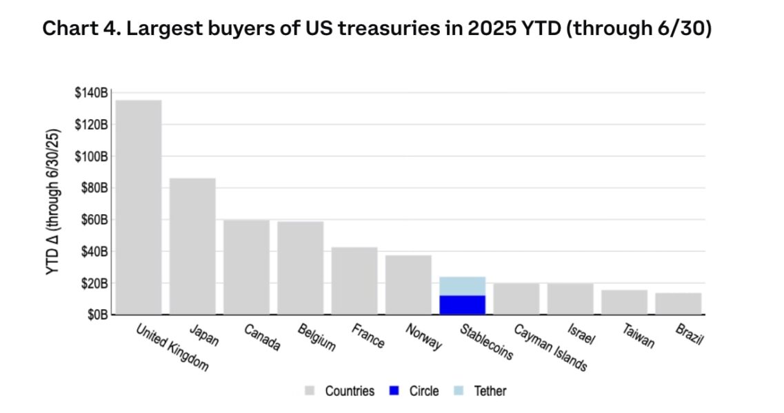 Private stablecoin issuers like Tether and Circle have become top buyers of US government debt, eclipsing countries like South Korea, the United Arab Emirates (UAE), and Germany.