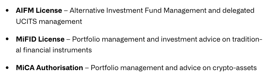 The AIFM license authorizes CoinShares to provide services in alternative fund management and delegated management under the EU’s Undertakings for Collective Investment in Transferable Securities Directive (UCITS).
