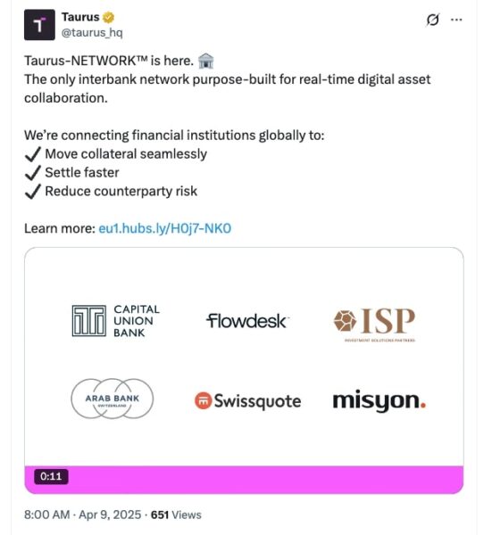 The Taurus-Network launches with participation from several banks worldwide, including Arab Bank Switzerland, Capital Union Bank, Flowdesk, ISP Group, Misyon Bank and Swissquote.