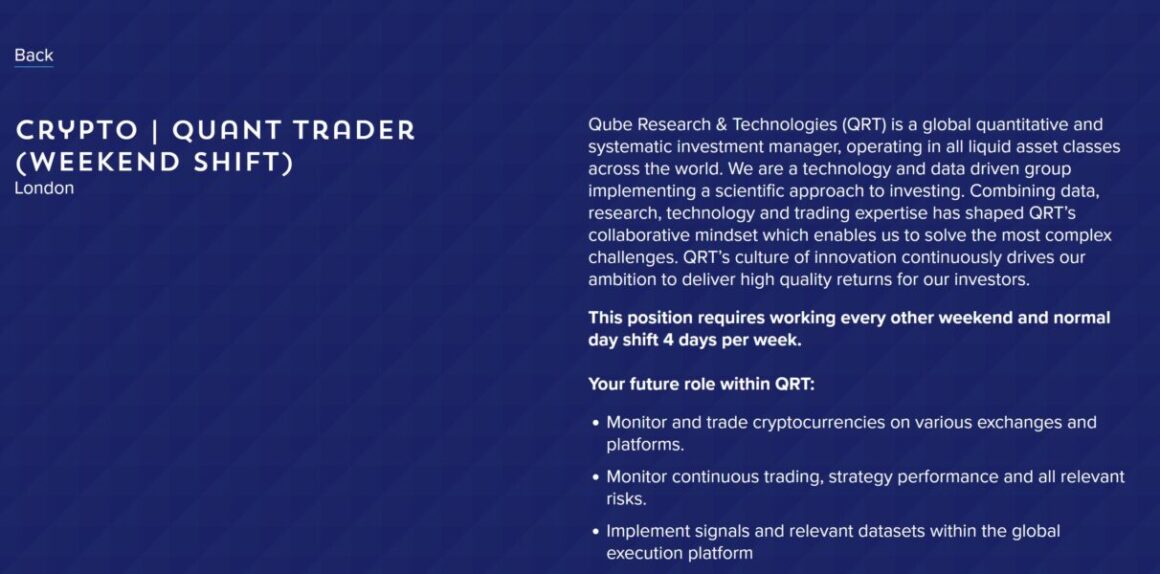 Qube Research & Technologies, a global quantitative investment management firm headquartered in London, is hiring for a “Crypto | Quant Trader (Weekend Shift)” role in London, which requires weekend availability in addition to a four-day workweek.