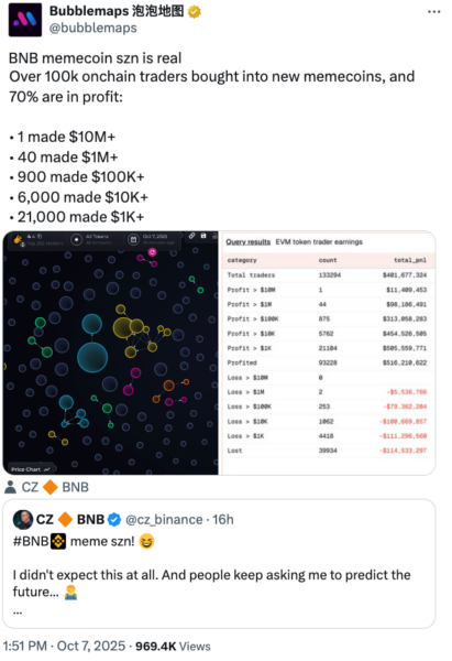 CZ is far from being the only one that profited from BNB’s market surge. According to the onchain analytics platform Bubblemaps, at least 70% of BNB Chain traders are currently in profit, with 40 traders each earning $1 million.