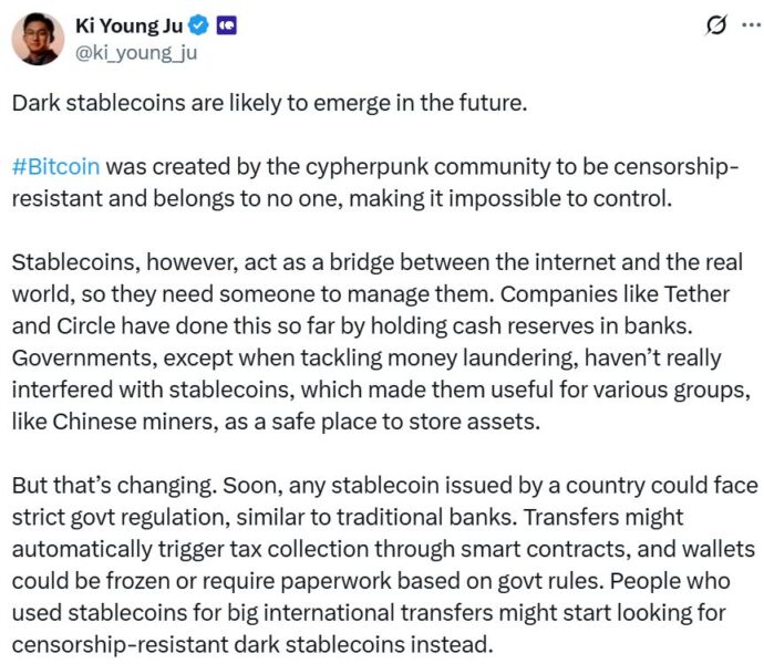 Stablecoins have been used for various groups to store assets due to a lack of government interference; however, with regulations pending, that could soon change, Ki Young Ju, CEO of crypto analytics firm CryptoQuant, said in a May 11 X post.