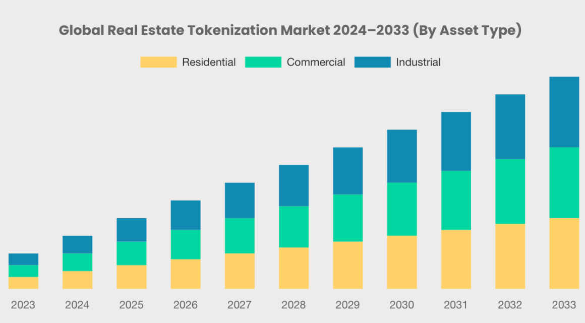 According to Custom Market Insights, the global real estate tokenization market is expected to reach a $19.4 billion market cap by 2033, growing at a compound annual rate of 21%. All three types of real estate — residential, commercial, and industrial — will play a role.
