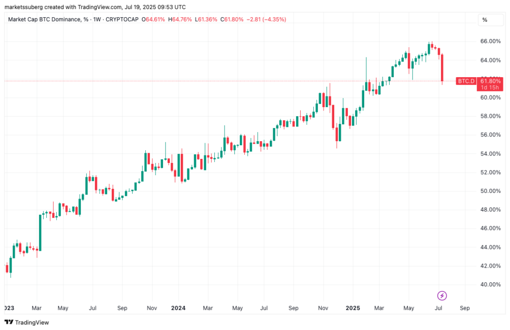 Bitcoin’s dominance of the overall crypto market cap has halted a multi-year uptrend, falling to 61.4% this week — its lowest value since March.