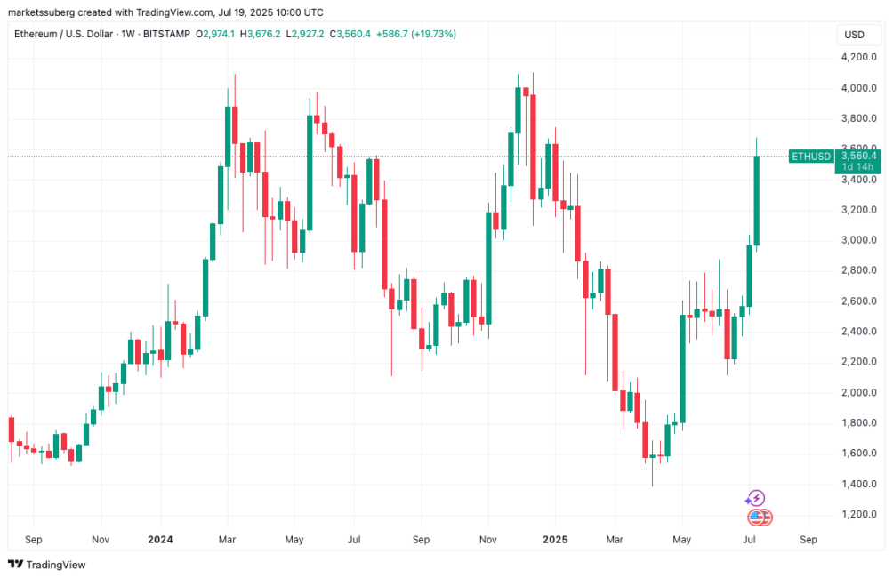 Data from Cointelegraph Markets Pro and TradingView confirms that ETH/USD gained 20% over the past week alone.
