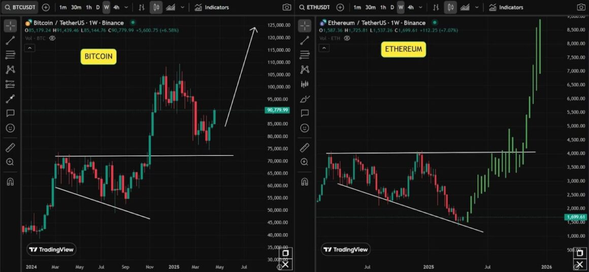 Market analyst “Ash Crypto” said ETH was “about to explode,” drawing comparison from the current chart pattern for Ether to that for Bitcoin’s performance in late 2024.