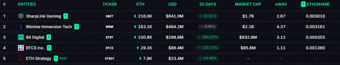 Other companies that have recently acquired Ethereum for corporate treasuries include digital asset platform Bit Digital, with more than 100,000 ETH, and Blockchain Technology Consensus Solutions (BTCS), which raised $62.4 million to expand its ETH holdings to 29,122 ETH this month.