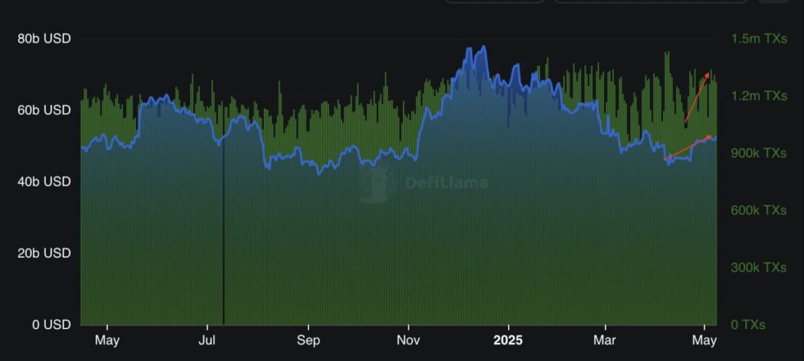 - Ethereum TVL surges 41% to $52.8 billion in 30 days, with a 22% rise in daily transactions to 1.34 million, signaling strong network recovery.