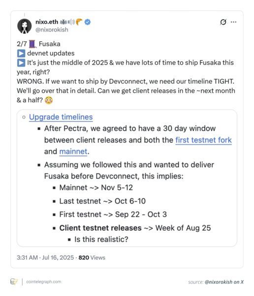 As part of the chain’s 2025 roadmap, Fusaka emphasizes Ethereum scalability updates and node health rather than user-facing features.