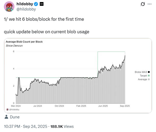 Buterin’s comments came in response to a post from the head of data at Dragonfly, Hildebert Moulié, observing that the network hit six blobs per block target for the first time on Wednesday.
