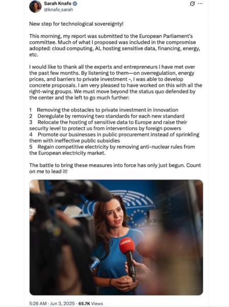 The European Parliament is set to vote on a technology sovereignty proposal submitted by the Committee on Industry, Research and Energy (ITRE) under the leadership of pro-Bitcoin lawmaker Sarah Knafo.