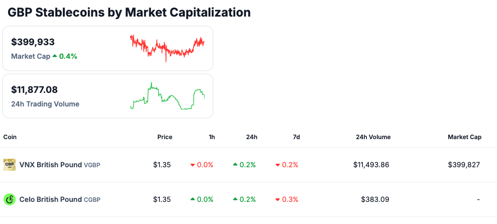 According to data from CoinGecko, there are only two tracked pound stablecoins at the time of writing, including VNX British Pound (VGBP) and Celo British Pound (CGBP), with a combined market cap of less than $500,000.