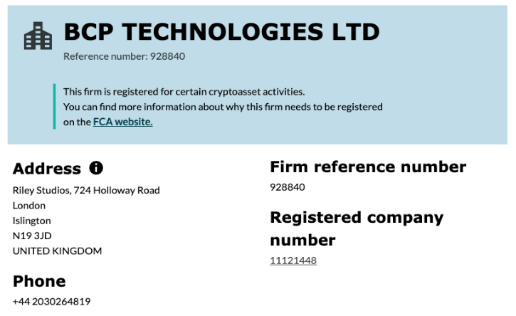 Acting as the issuer, BCP Technologies has been an FCA-registered crypto asset service provider since 2021, formerly known as BitcoinPoint, according to official FCA records.