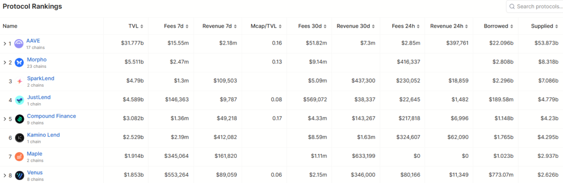 AAVE protocol’s $31.7 billion TVL currently accounts for 47% of the total DeFi lending value, while Morpho’s $5.5 billion accounts for over 8.2%.