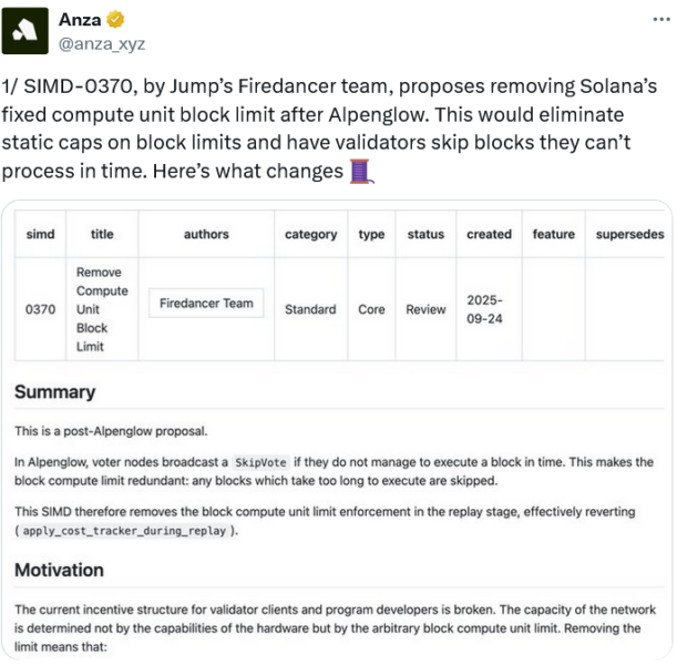 Jump, which is building a high-performance Firedancer validator client for Solana, is pushing for the SIMD-0370 proposal to be implemented sometime after the Alpenglow upgrade, Solana research company Anza said on Saturday.