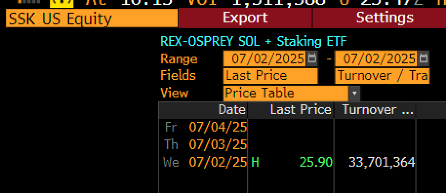 The REX-Osprey Solana Staking ETF debuted on the Cboe BZX Exchange on Wednesday, recording $33 million in trading volume and $12 million in inflows, according to Bloomberg ETF analyst Eric Balchunas.