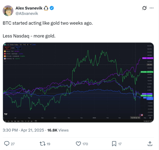 On April 22, Alex Svanevik, co-founder and CEO of the Nansen crypto intelligence platform, said Bitcoin’s price is showcasing its growing maturity as a global asset, becoming “less Nasdaq — more gold.”