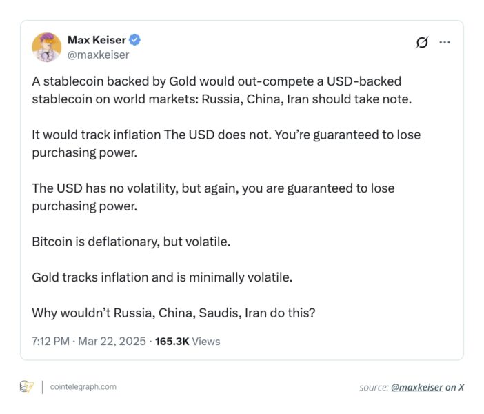 Two factors favoring gold-backed stablecoins are their inflation-resistant properties and long-term stability. As Bitcoin advocate Max Keiser points out, gold enjoys greater global trust than the US dollar, particularly among nations with strained relations with the US.