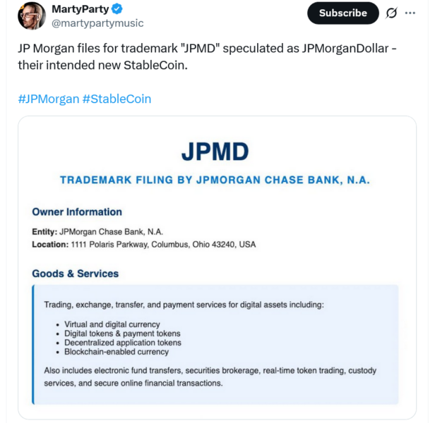 Source: https://cointelegraph.com/news/jpmorgan-files-jpmd-trademark-crypto-payment-services