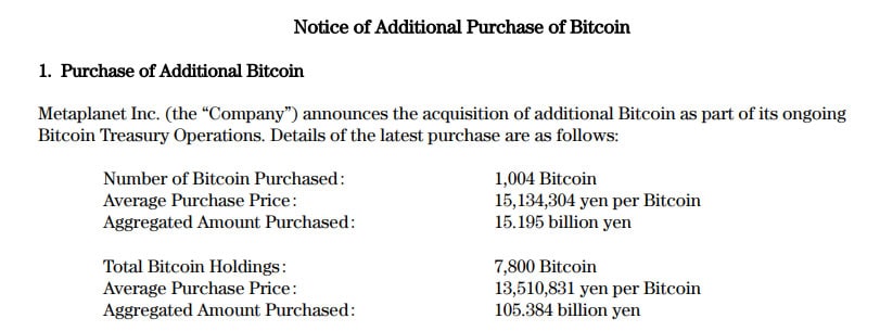 Metaplanet said on May 19 that it purchased 1,004 Bitcoin for a total cost of around 15.2 billion yen ($104.6 million), bringing its total holdings to 7,800 Bitcoin worth around $807 million at current market prices.