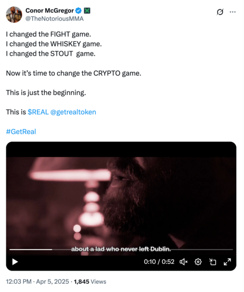 Mixed-martial arts (MMA) champion Conor McGregor launched a memecoin called “REAL” on April 5, which will reportedly feature staking rewards and voting rights for token holders.