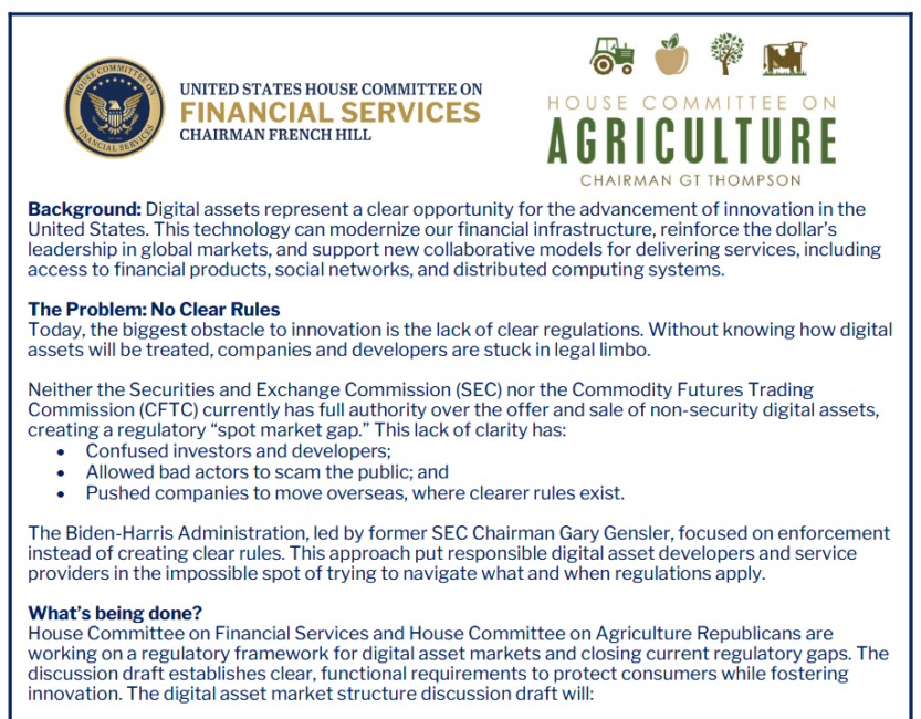 The discussion draft, led by the House agricultural and financial services committee chairs Glenn Thompson and French Hill, is an “incremental, albeit meaningful, rewrite” of the Financial Innovation and Technology for the 21st Century Act (FIT21), Paradigm’s vice president of regulatory affairs Justin Slaughter said in a May 5 X post.
