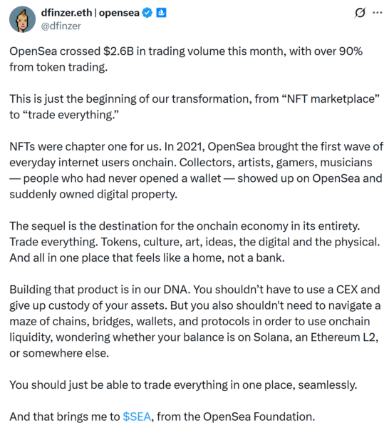 In a Friday post on X, Finzer announced that OpenSea’s October trading volume exceeded $2.6 billion, with over 90% of that amount coming from token trading, calling it the beginning of the platform’s transformation to “trade everything.”