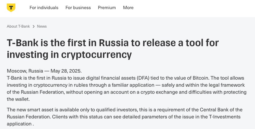 T-Bank (formerly Tinkoff Bank), one of the largest commercial banks in Russia, announced on May 29 the offering of digital financial assets (DFA) tied to Bitcoin.