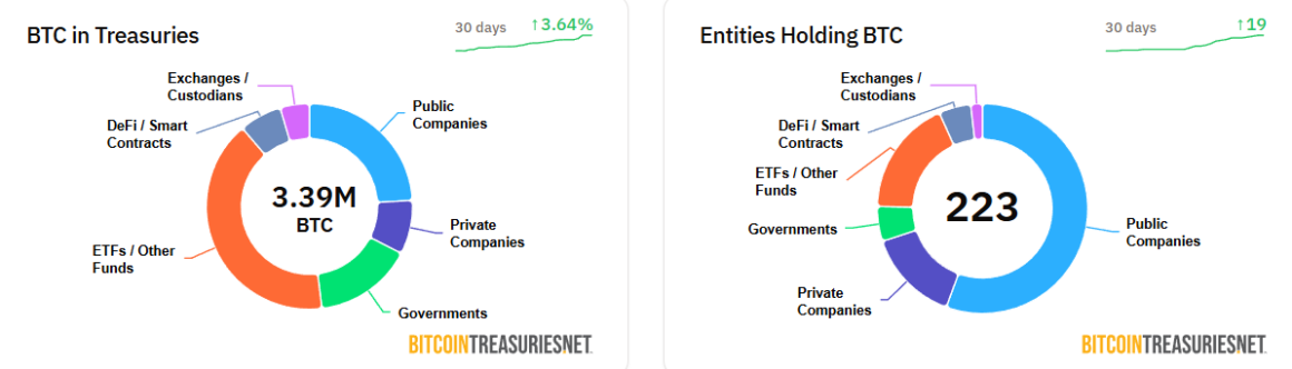 At least 124 public companies are now holding Bitcoin as part of their corporate treasury, according to data from BitcoinTreasuries.NET.
