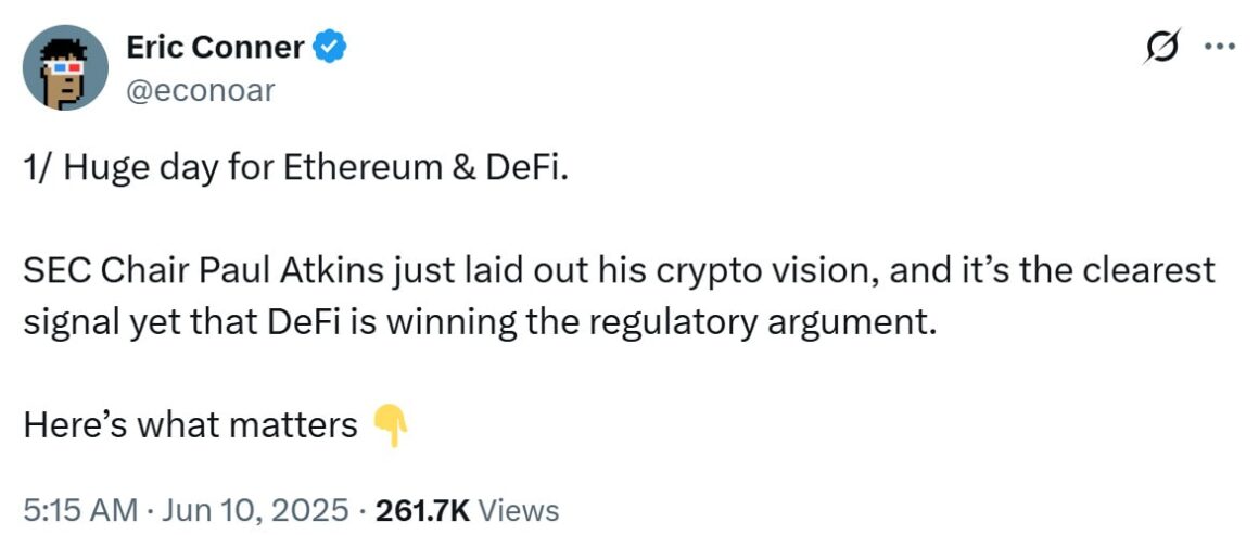 Supporters in the crypto industry are excited about the bill. Ethereum developer Eric Conner described this act as “the clearest signal yet that DeFi is winning the regulatory argument.”