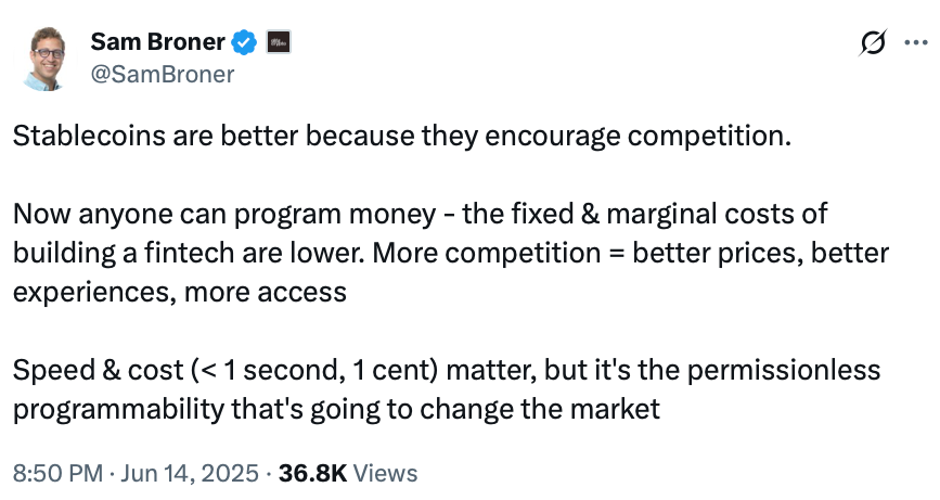Allaire’s comments came in response to a16z Crypto partner Sam Broner, who said in a post on the same day that “stablecoins are better because they encourage competition.”