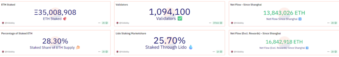 Over 35 million Ether coins are now staked under the Ethereum blockchain’s proof-of-stake consensus model, according to data from Dune Analytics.
